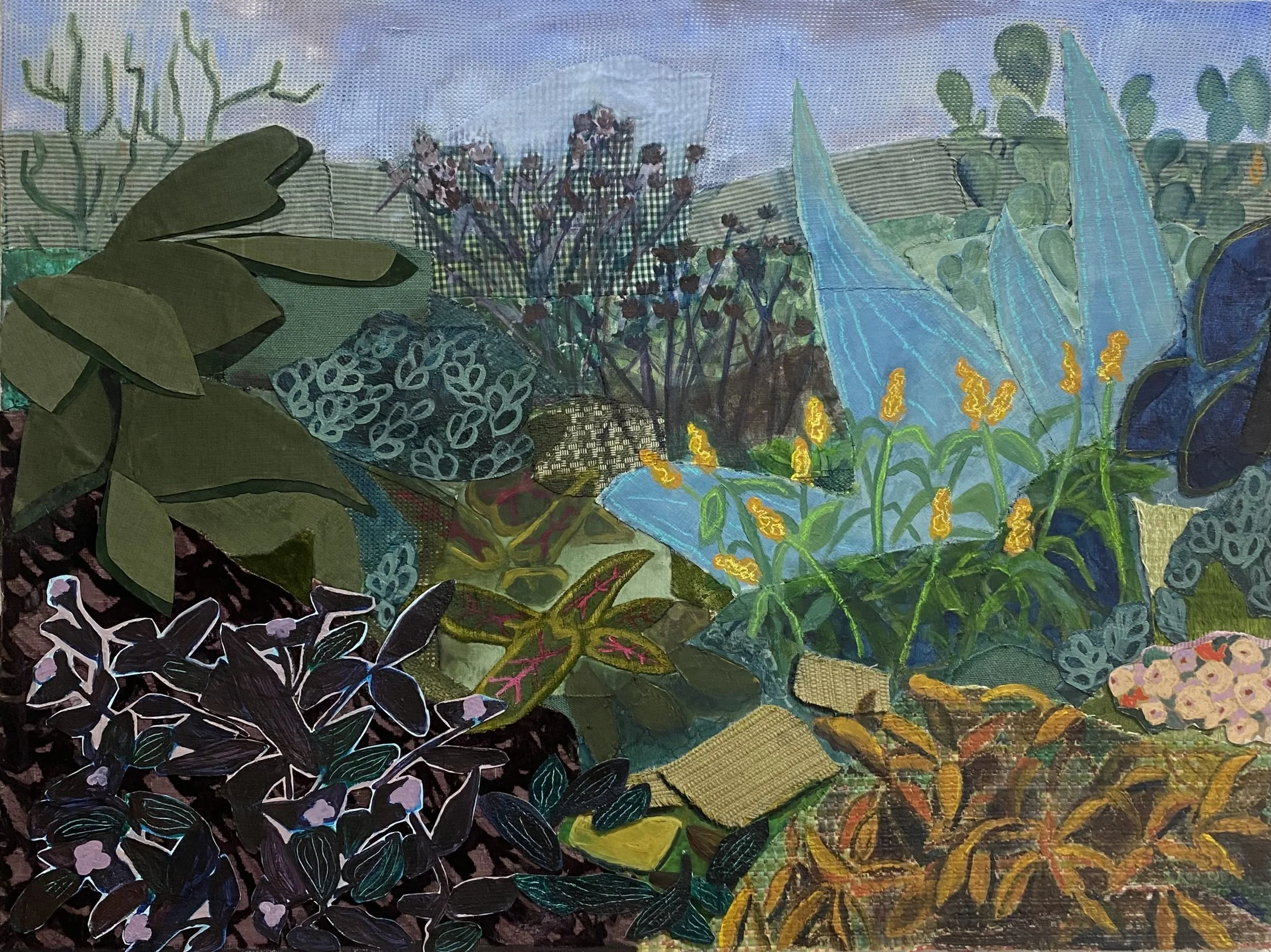 I am an emerging artist based in Austin, Texas, working with textiles, paint, paper, and mixed media to explore the relationship between nature and domesticity. Through collage and the use of vibrant colors and rich textures, I examine the tension between the natural world and the objects we create to contain it. I am drawn to the human desire to both celebrate nature’s wildness and attempt to capture and contain it—placing it on a shelf, a wall, or within a vessel.
