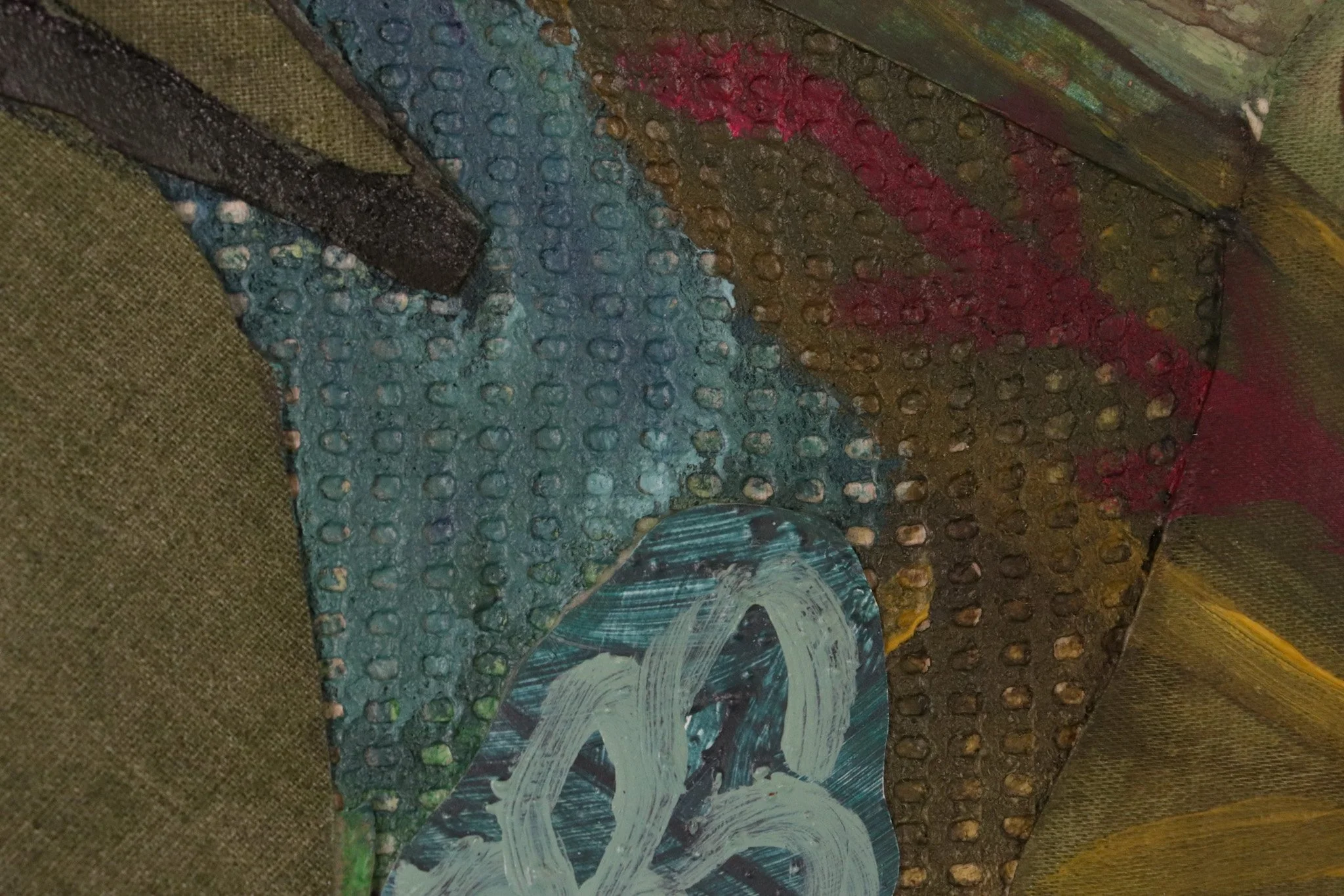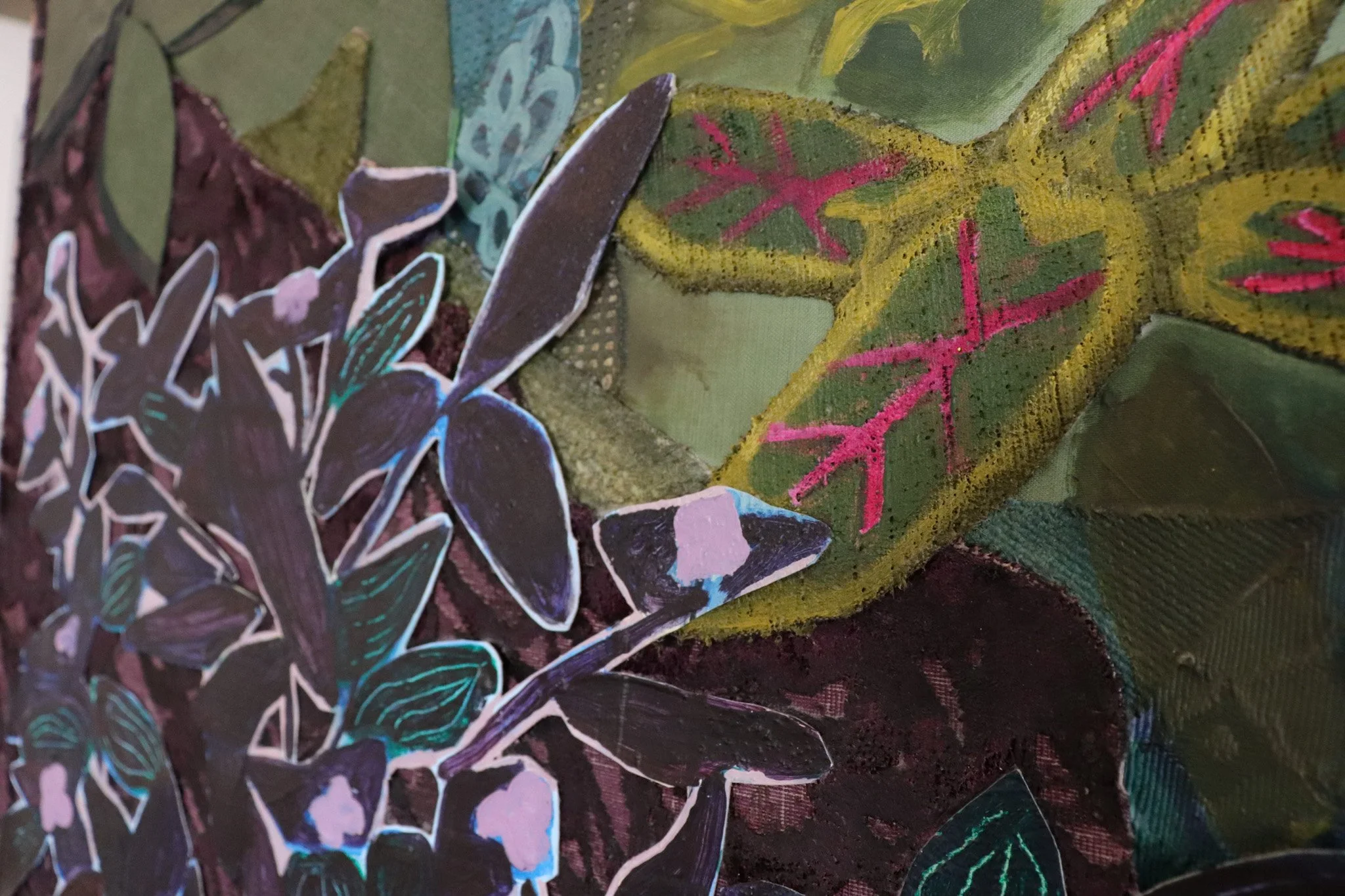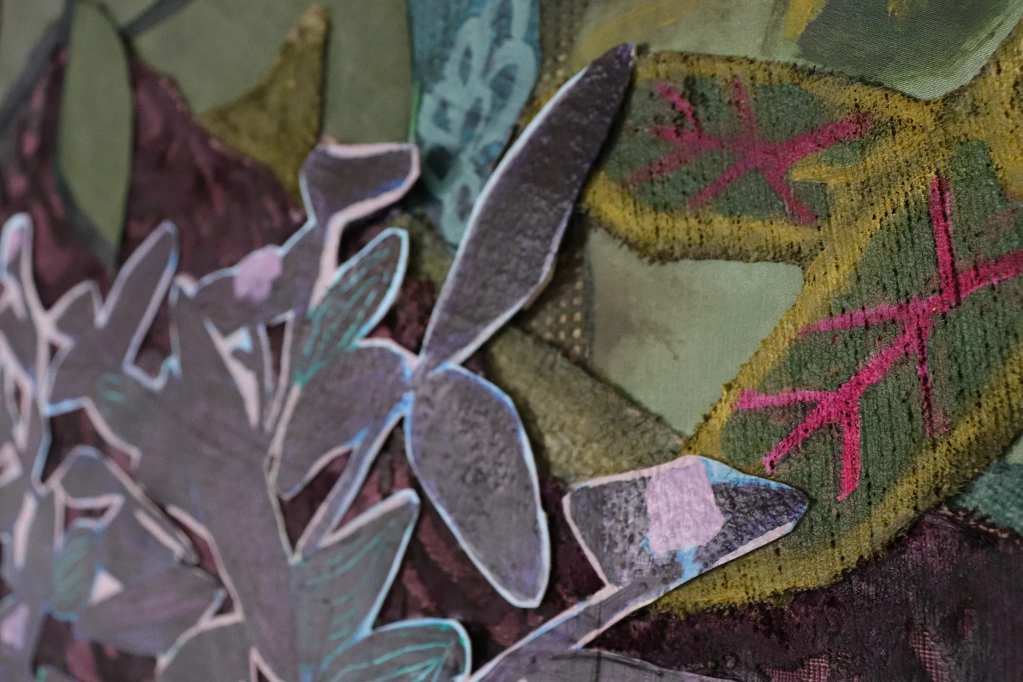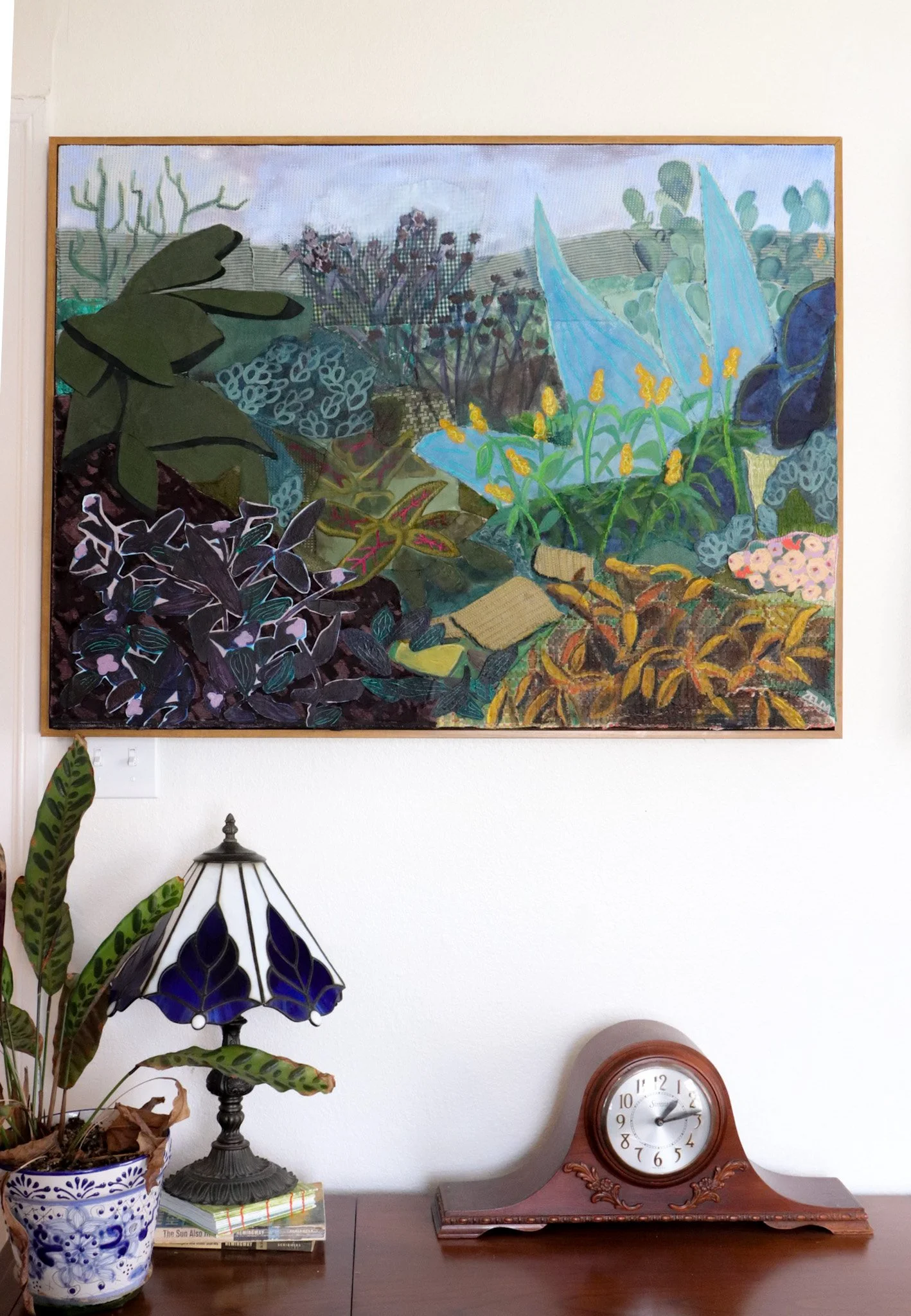 Jubilee, Jubilee is a layered composition that merges the rugged landscapes of Maine, where we spend cherished time with family, with the flora of Central Texas. In this piece, I use manmade materials—specifically textiles—to replicate the forms and textures of plants. The collage incorporates fabric, paper, soft pastels, acrylic paint, and elements from my previous works, which I cut up and recycled into this piece. The result is a celebration of both natural and constructed beauty, capturing the essence of two distinct environments through the interplay of materials and form.