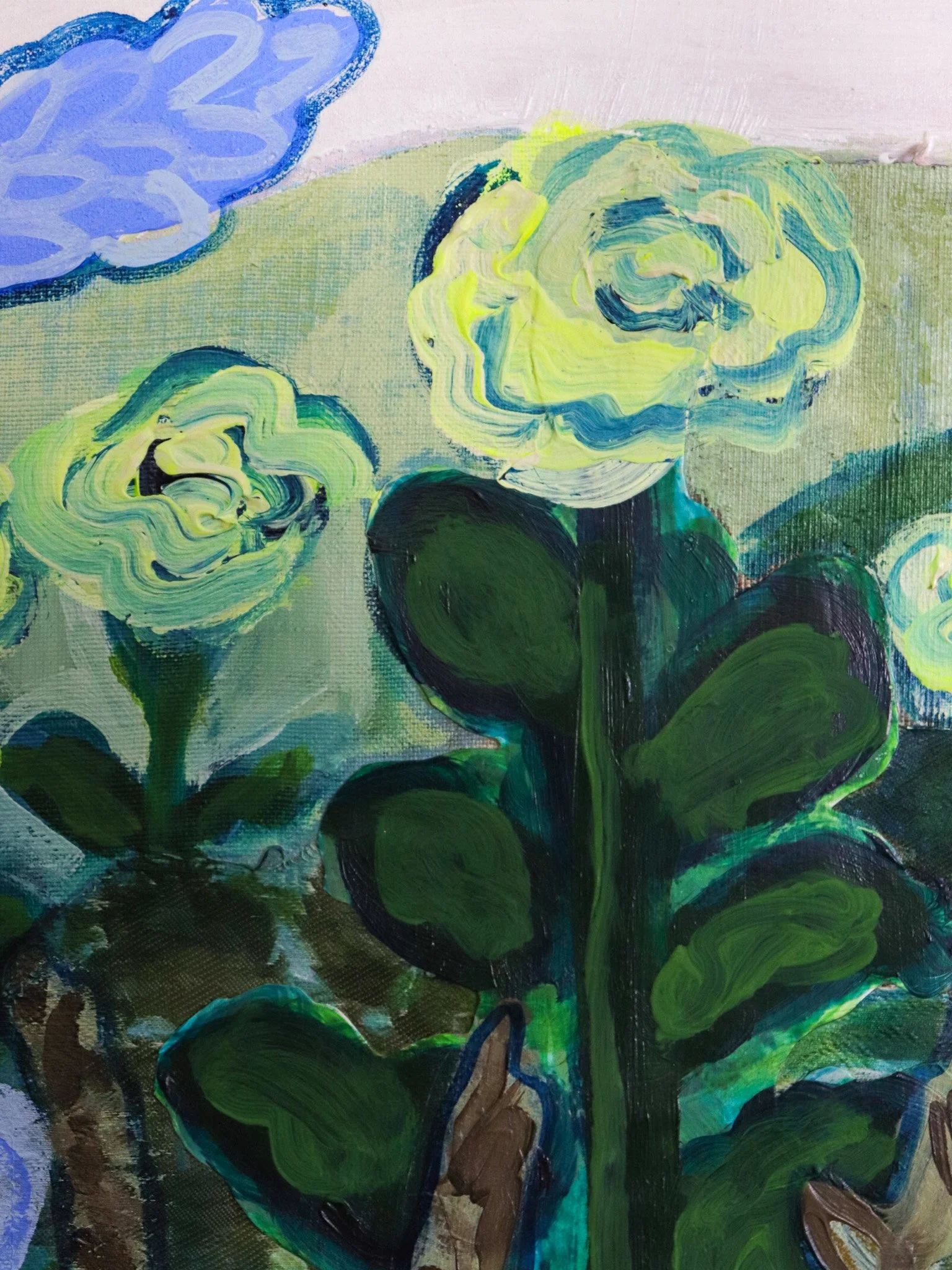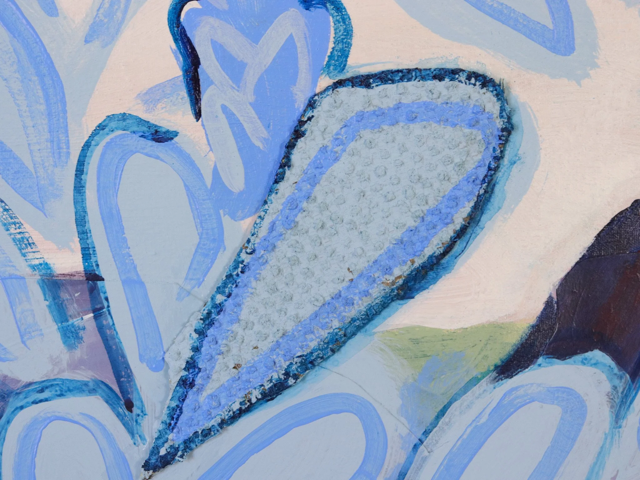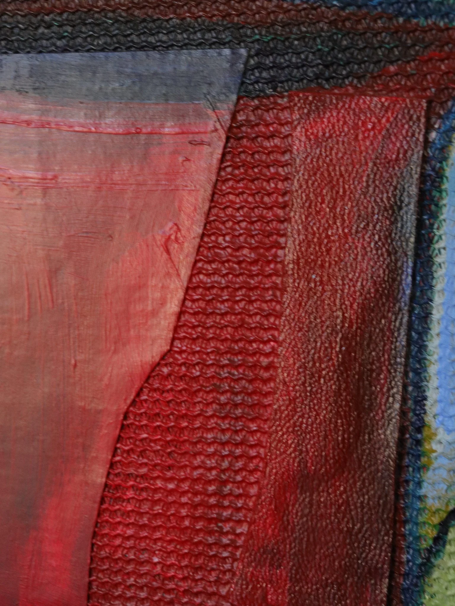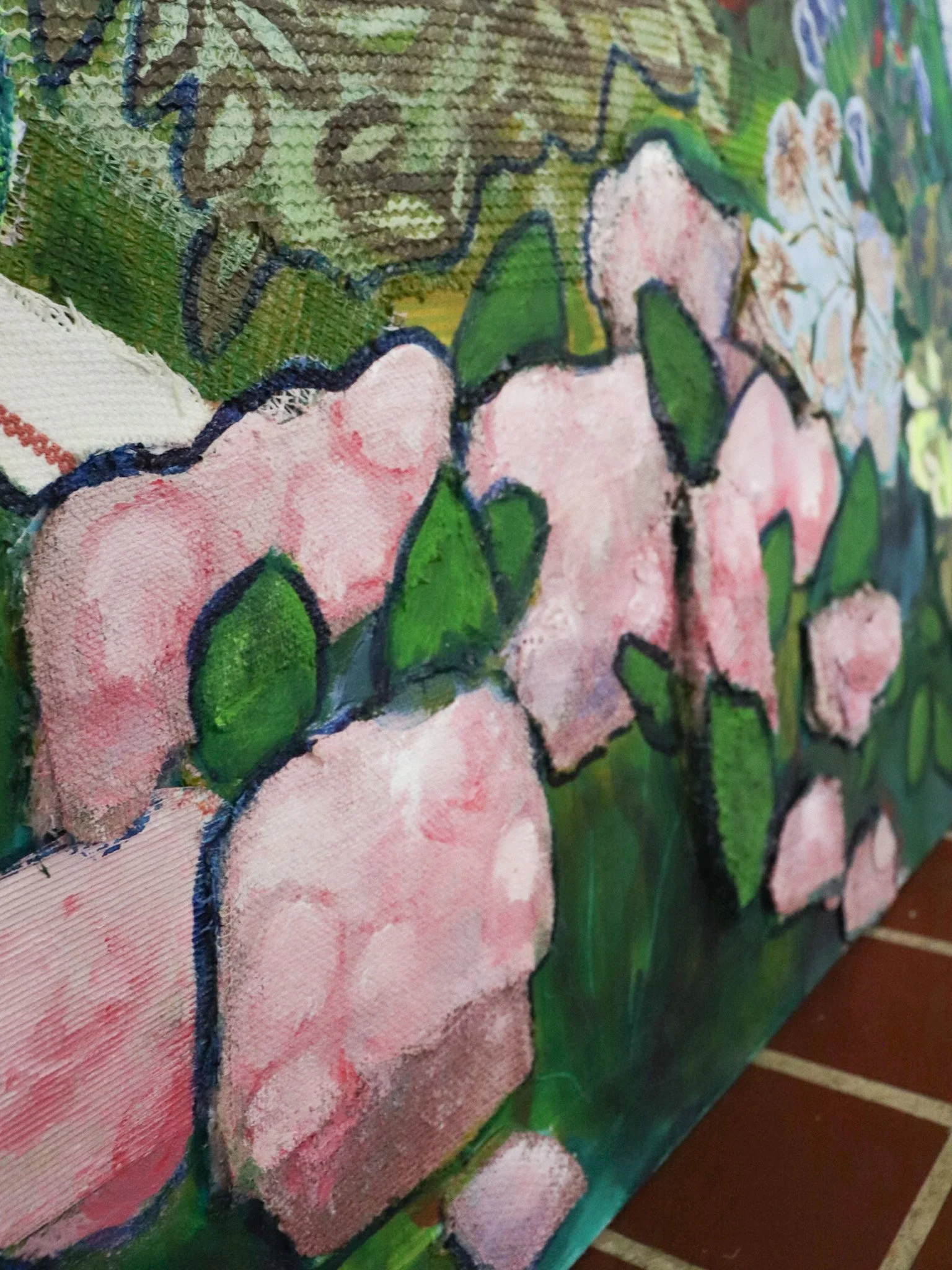 Inspired by time spent with family along Maine’s Marginal Way, this piece captures the abundance and color of a garden in bloom. Layered fabrics and painted textures blend memory and landscape, evoking the richness of shared moments and the sensory pull of summer light.