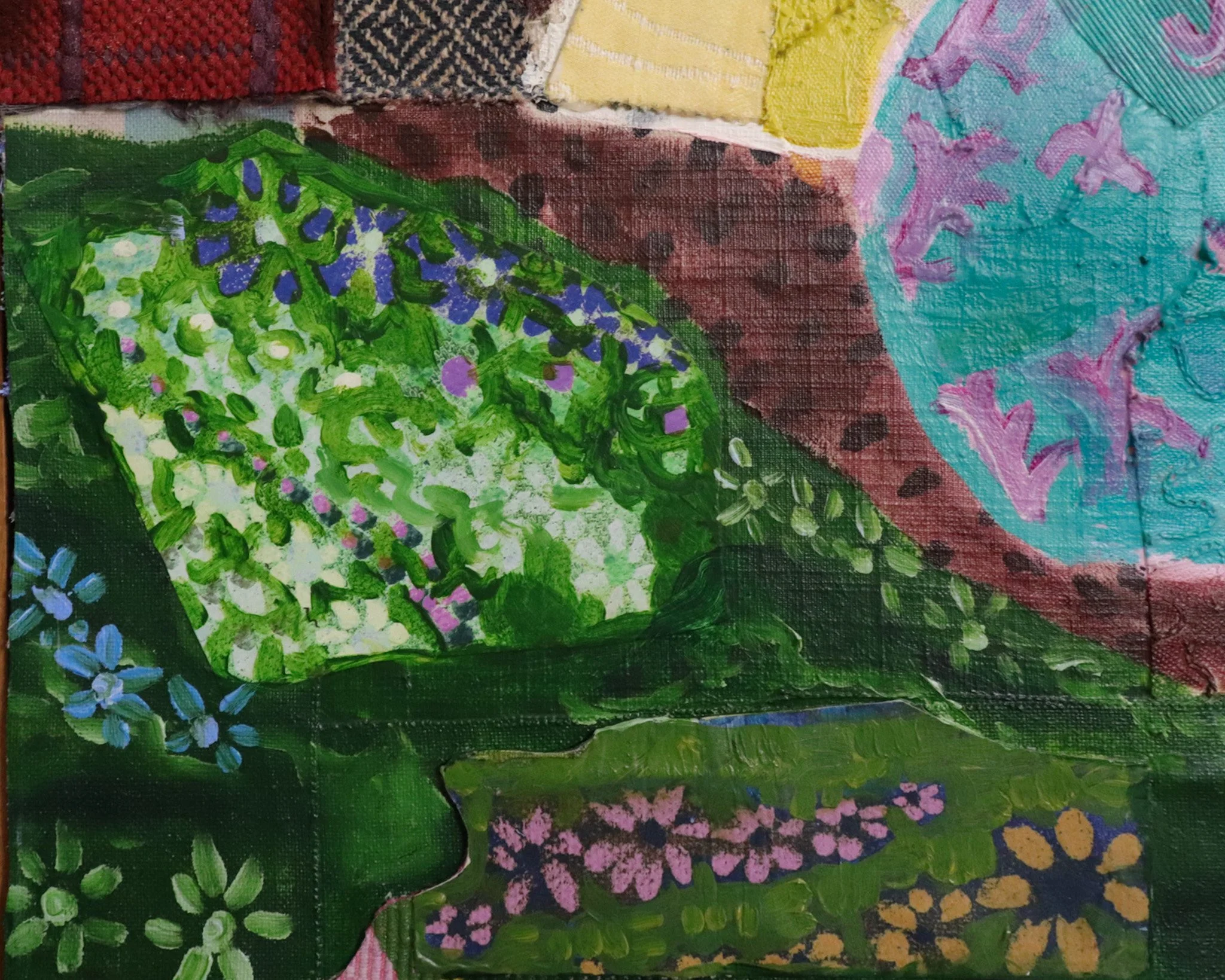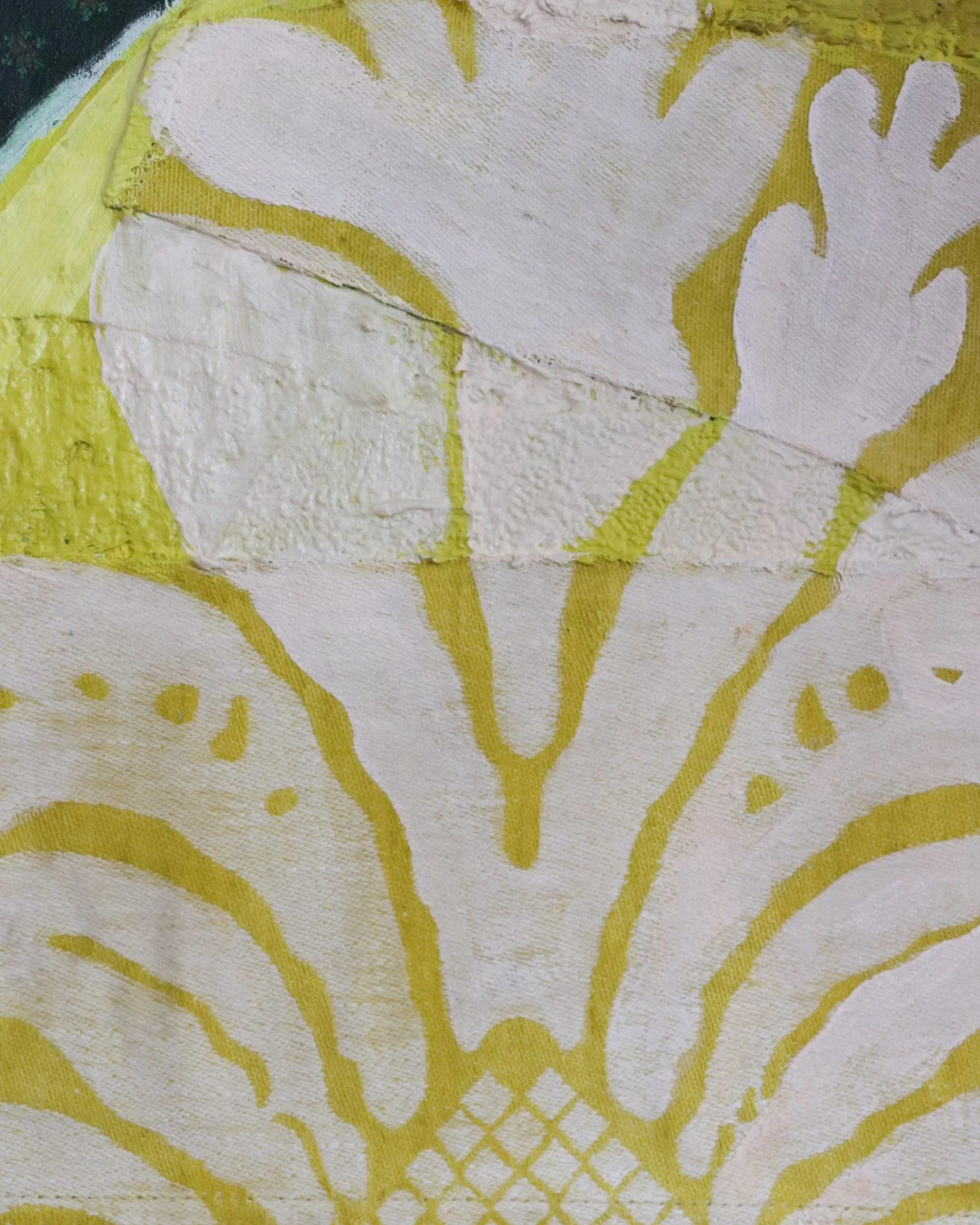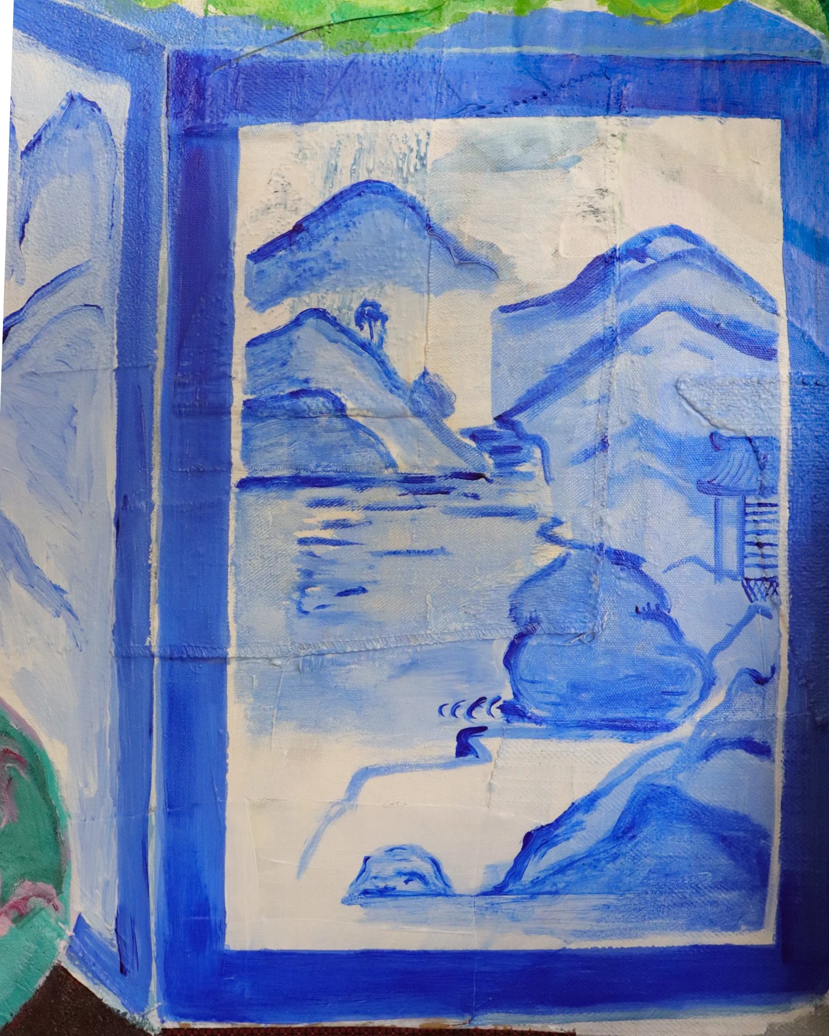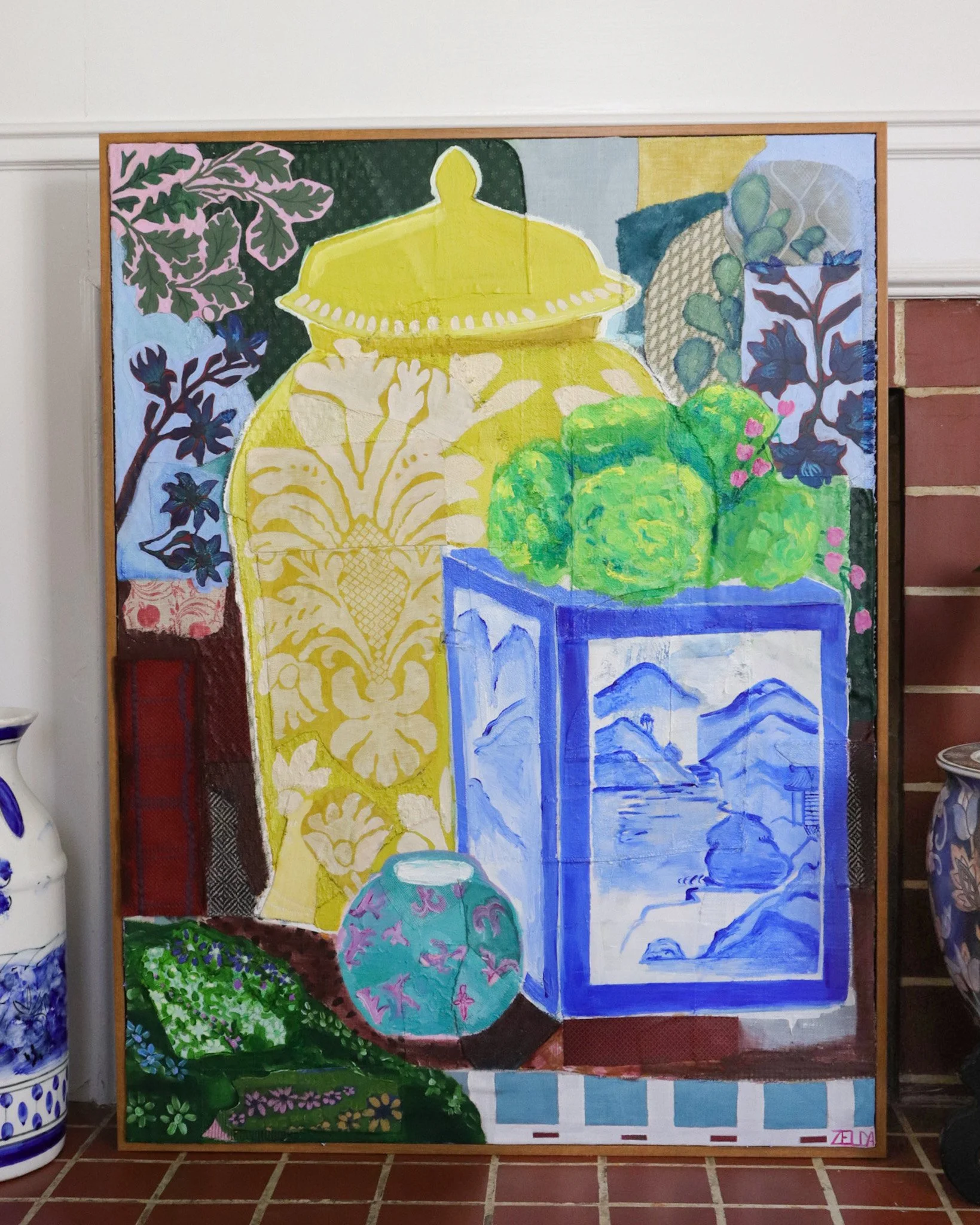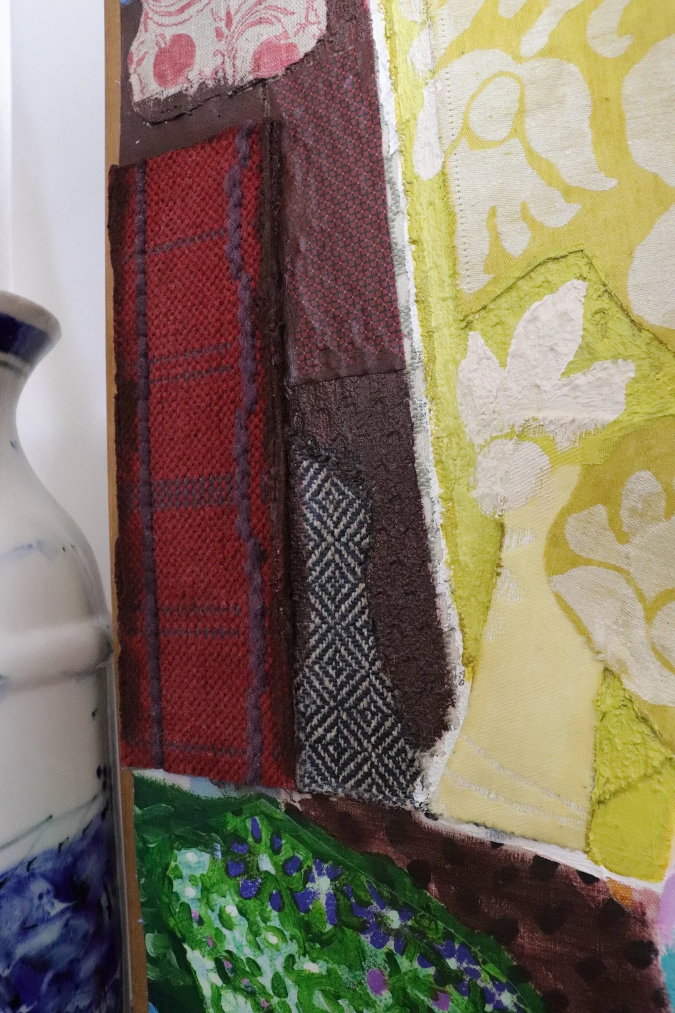This piece delves deeper into my ongoing exploration of the ginger jar motif, a recurring symbol in my work. Unlike previous pieces, Porcelain Pots intentionally sets the jar within an actual garden landscape, blurring the lines between the contained and the natural world. The layers of fabric, paper, and acrylic paint come together to create a composition that feels both curated and organic, reflecting the tension between our desire to collect and the uncontrollable beauty of the outdoors.