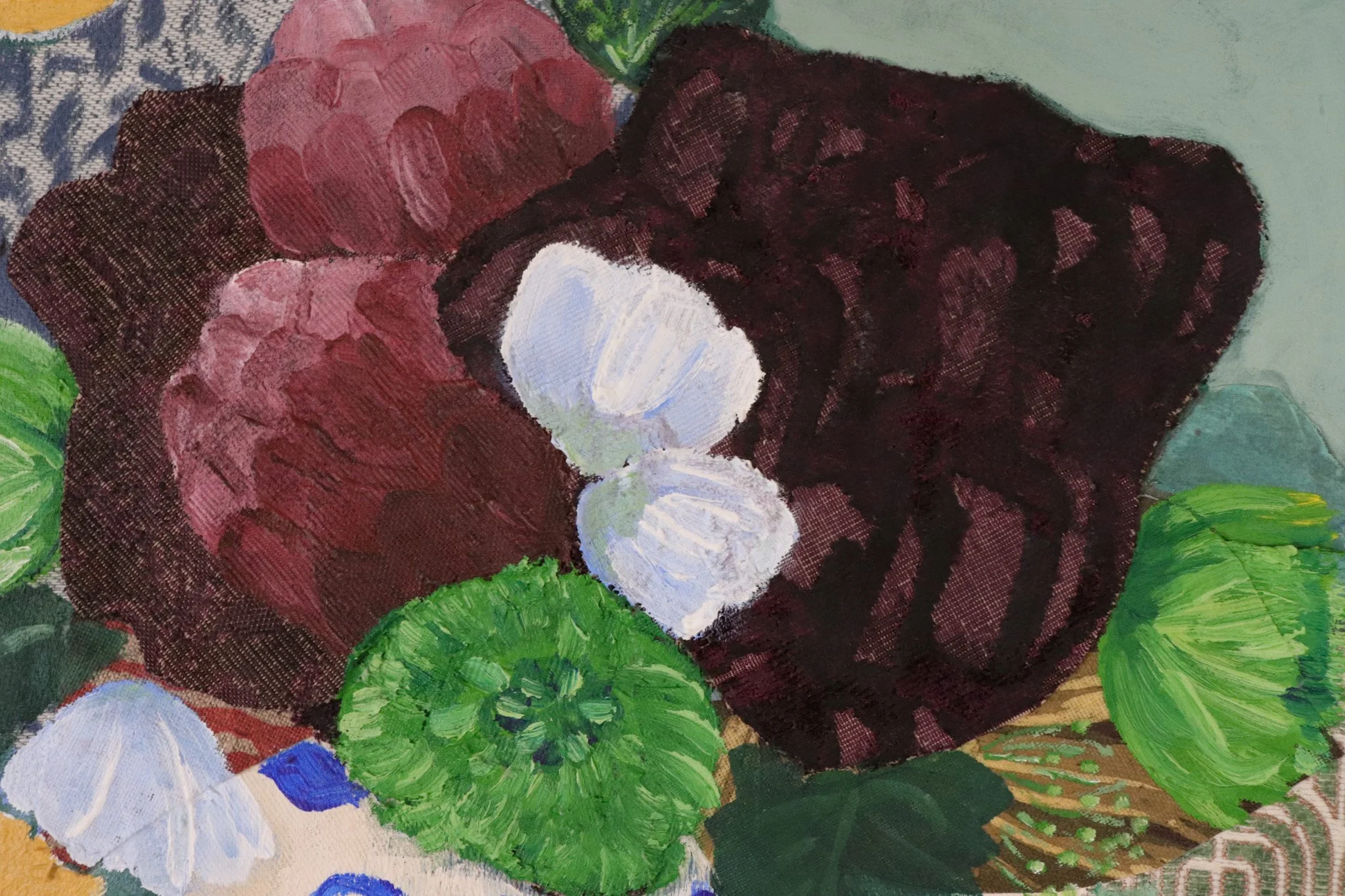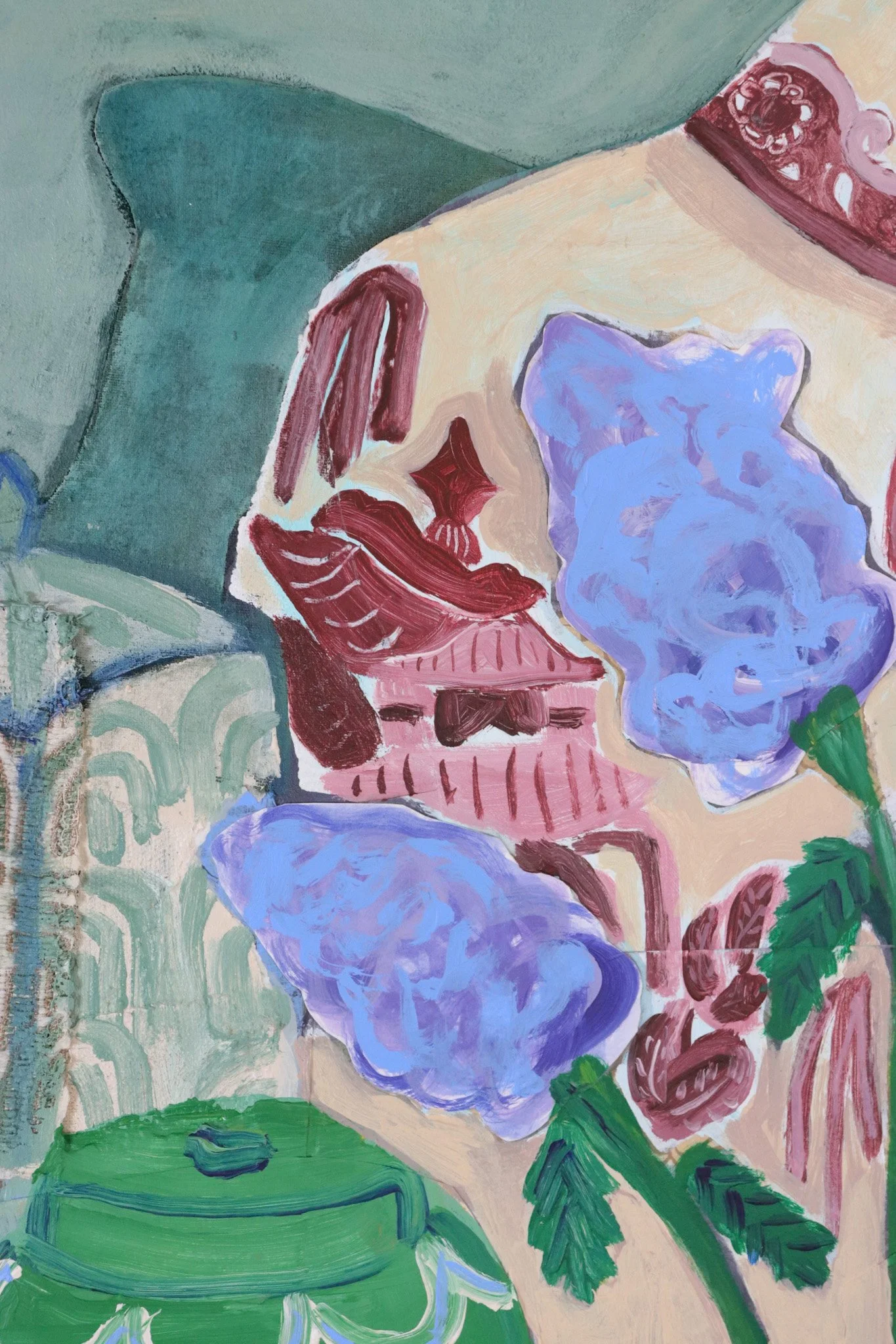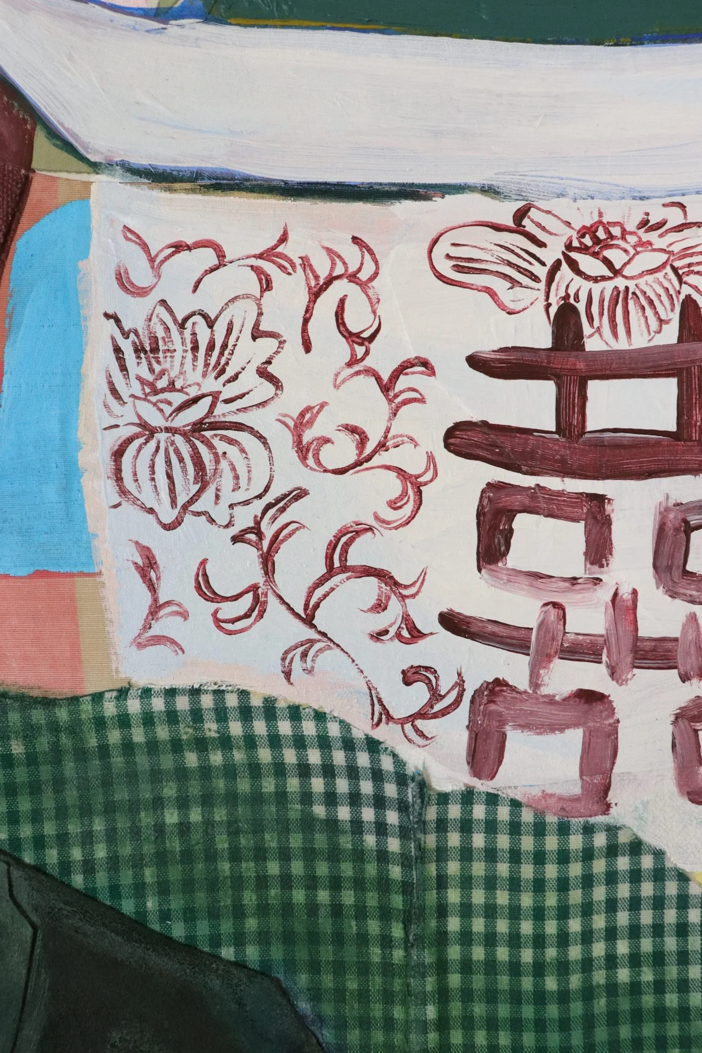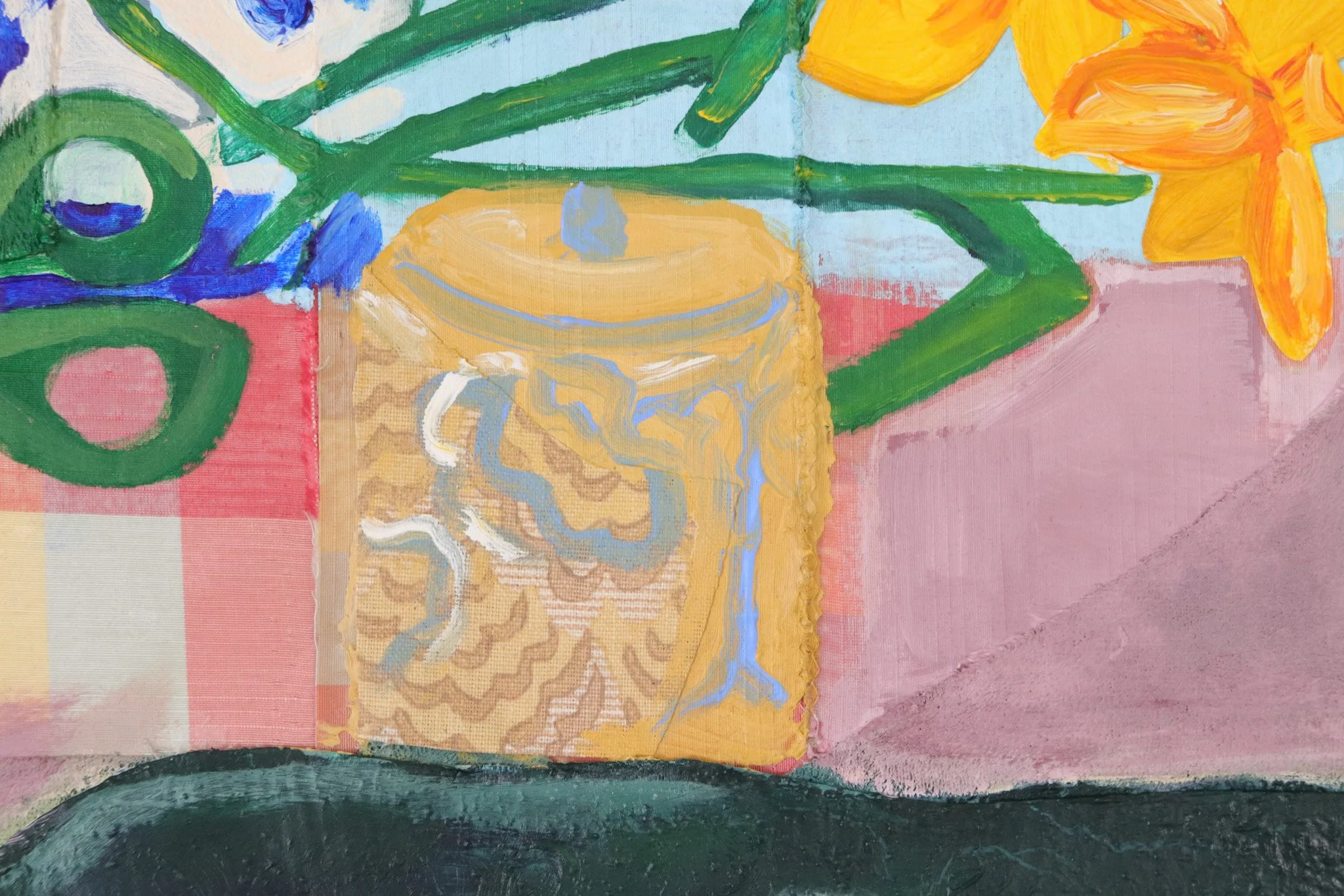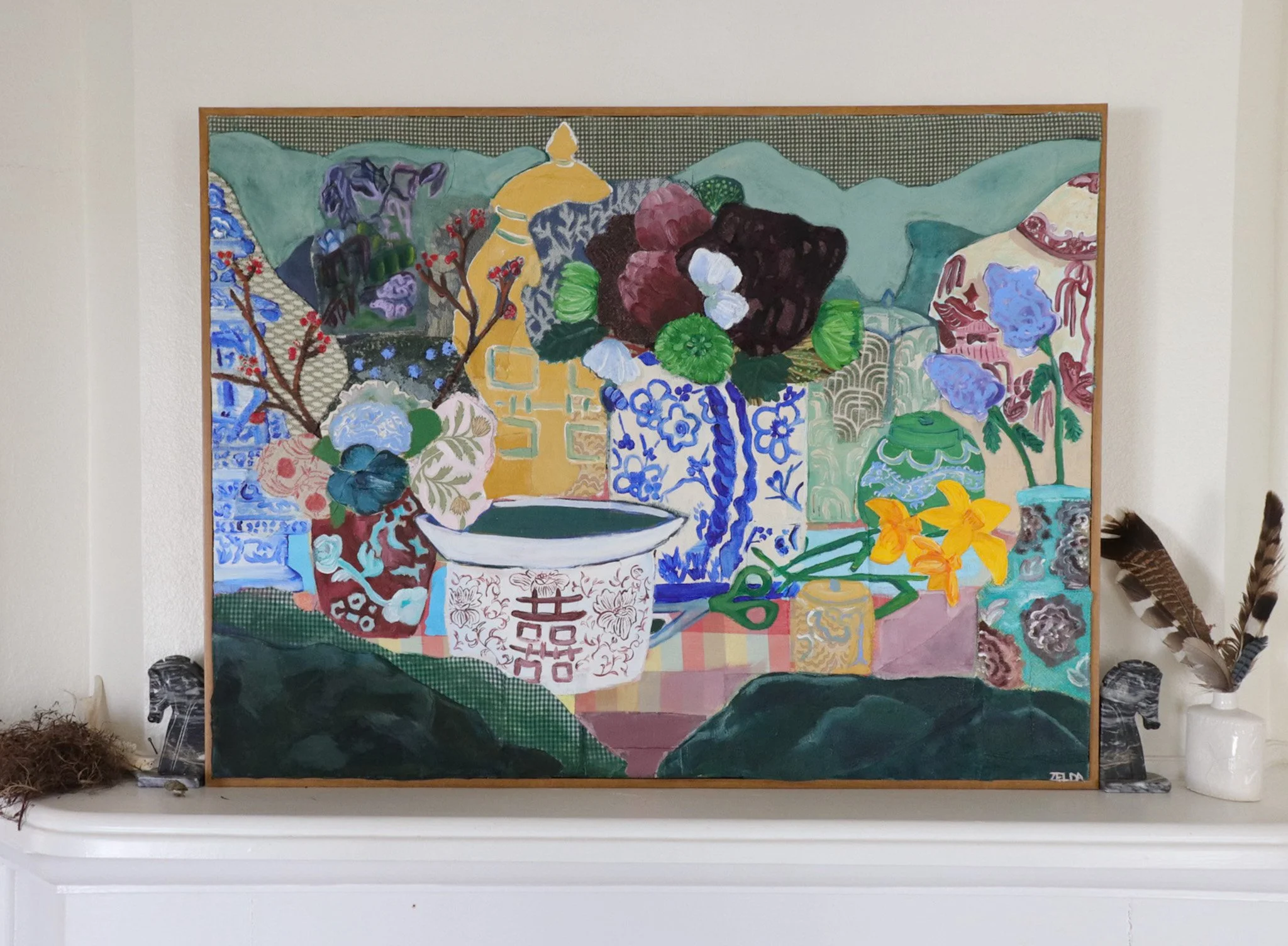 This piece layers fabric, paper, pastels, and acrylic paint to create a composition that feels both collected and curated. At the center of it all is the ginger jar—a recurring symbol in my work. It represents the human desire to capture and contain nature, to preserve beauty in a way that’s both intentional and limiting. The jar’s presence in this piece is a reminder of the tension between celebrating nature and the act of trying to replicate it.