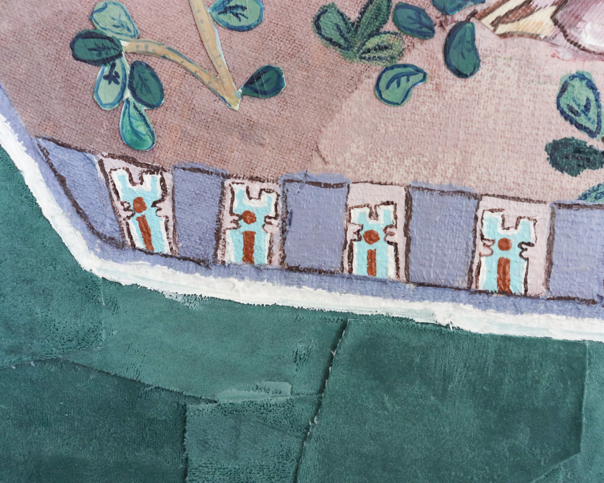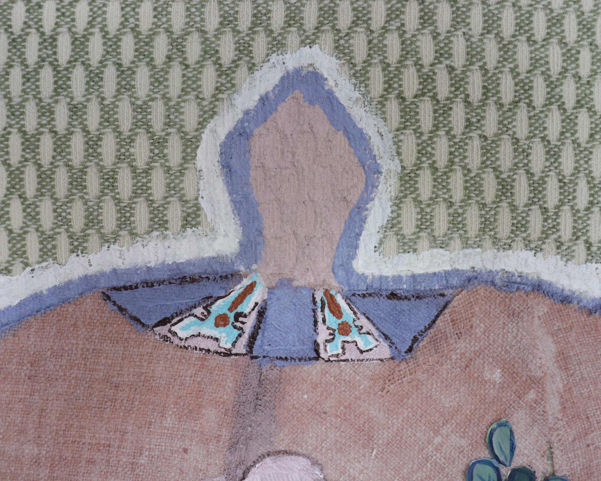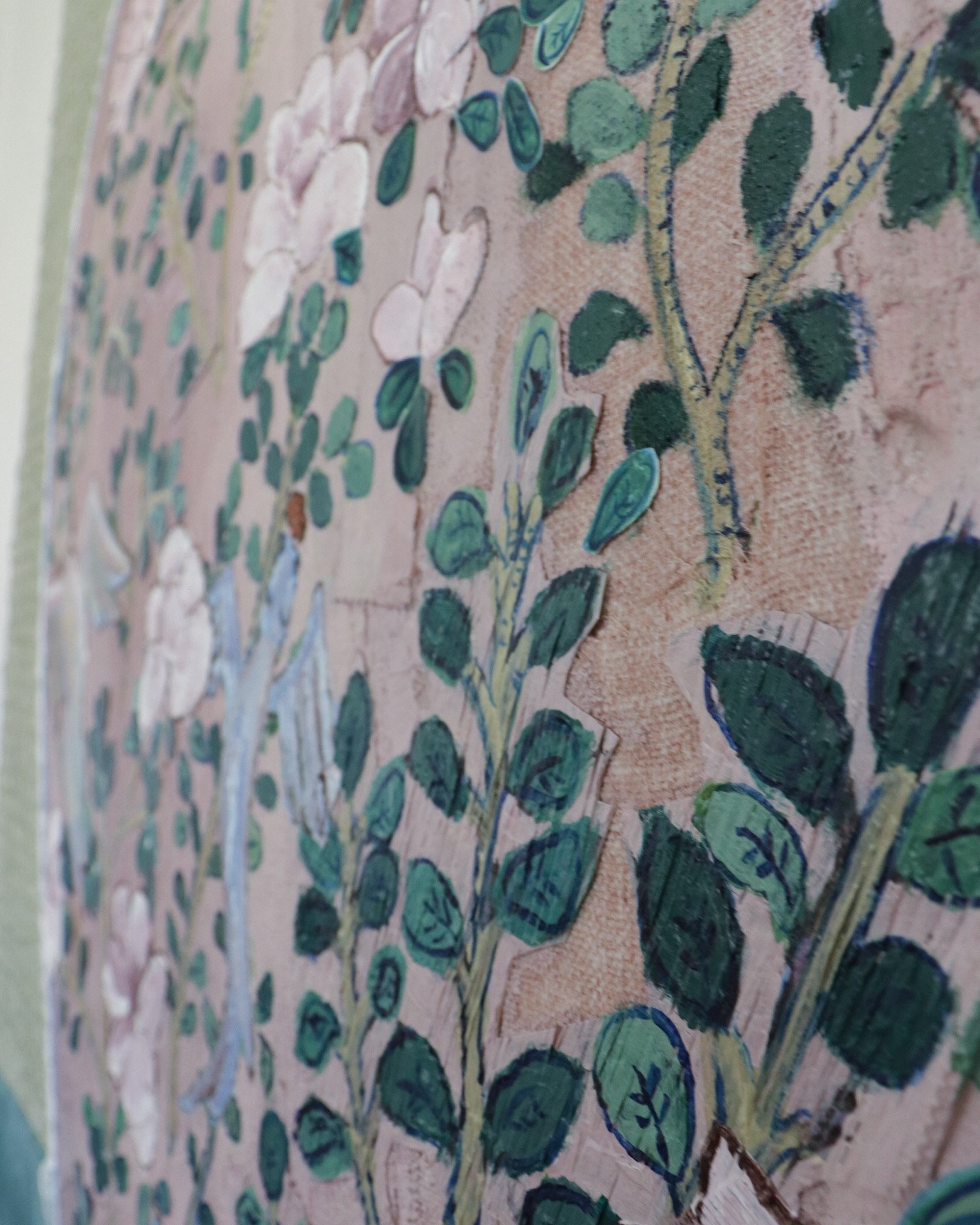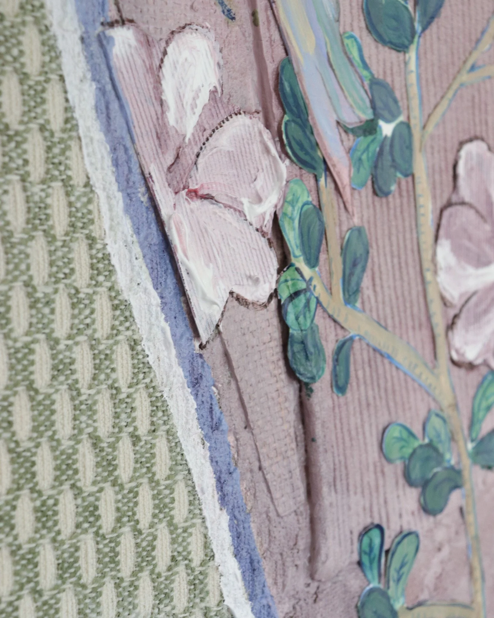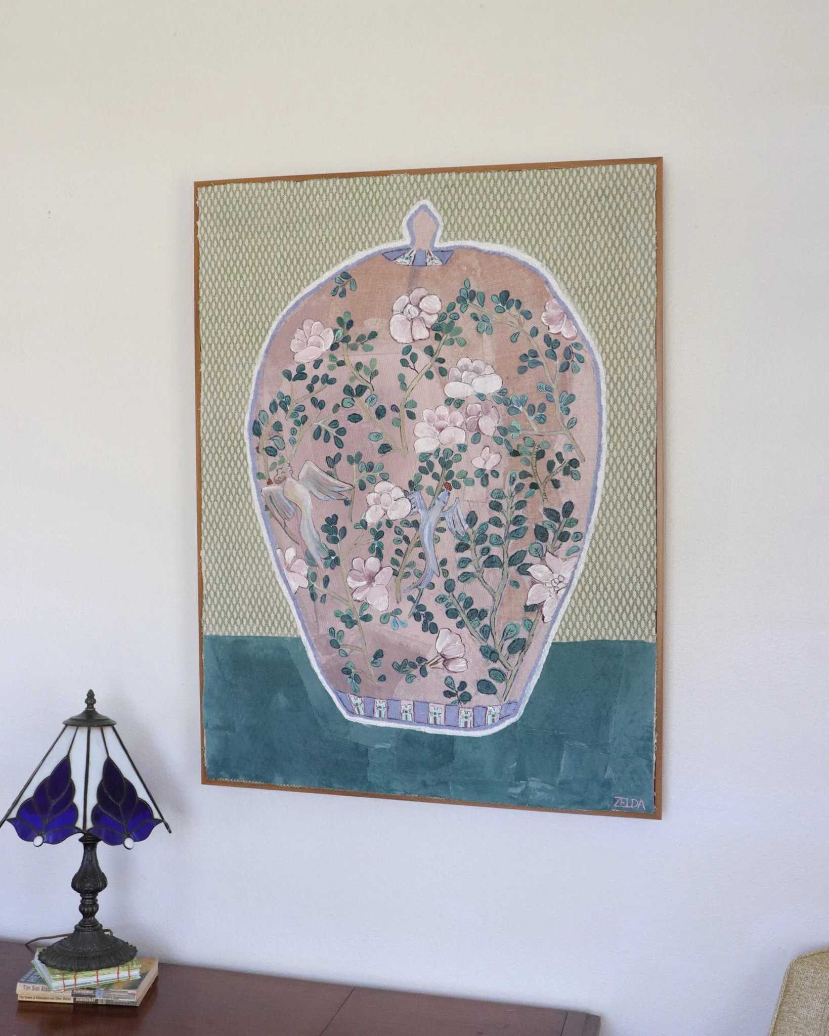 The Dragons is inspired by a lamp in my home crafted from a ginger jar. The lamp's design features a dragon motif, a common decoration on porcelain ginger jars. These dragons, often depicted amidst stylized clouds, symbolize strength, good fortune, and protection. In this piece, I layered fabric, paper, and acrylic paint to create a composition that reflects the lamp's design and the symbolism of the dragon. The warm walnut frame complements the rich tones within the artwork, enhancing its presence. This piece invites viewers to explore the interplay between the manmade and the natural world, capturing a sense of guardianship and harmony.