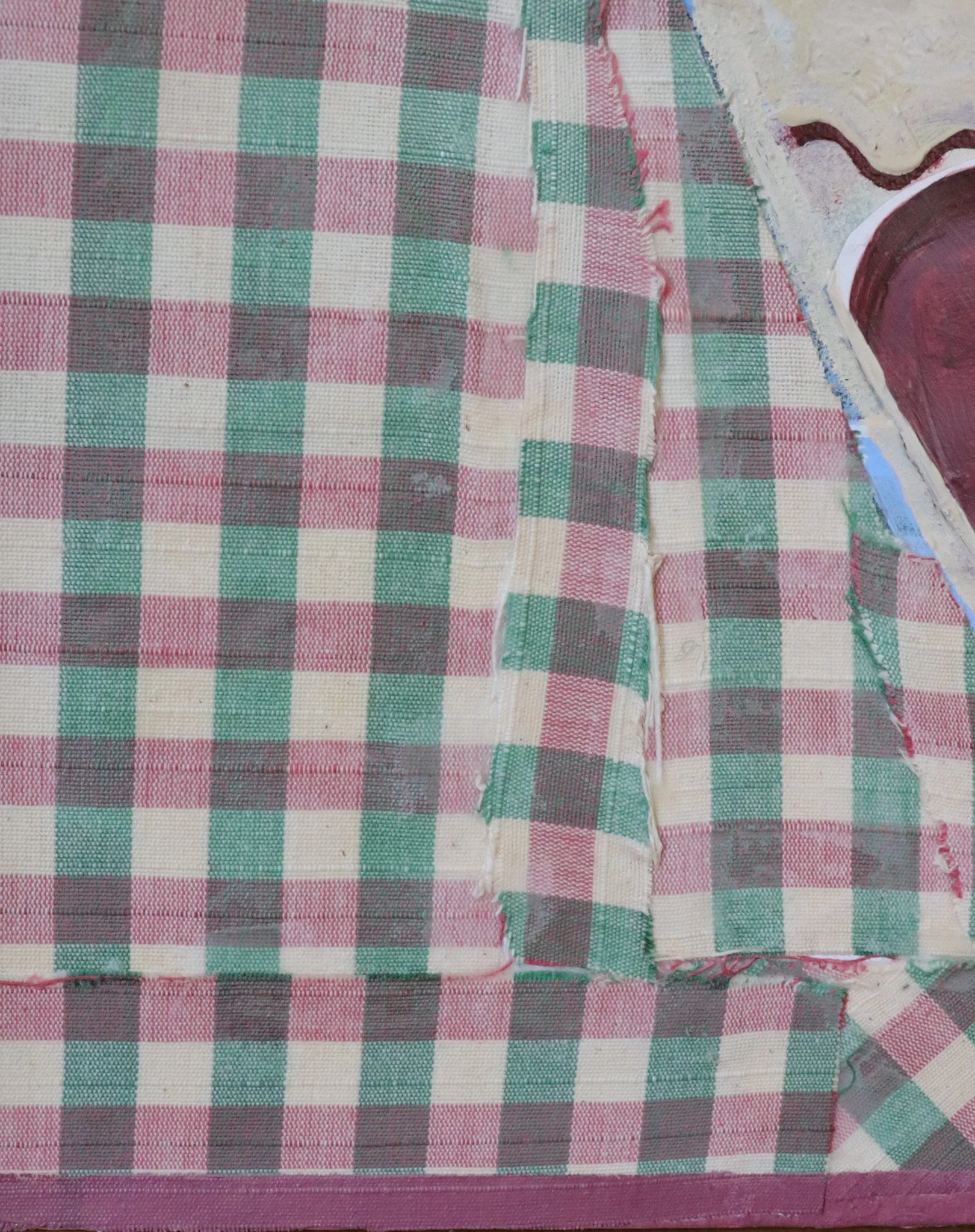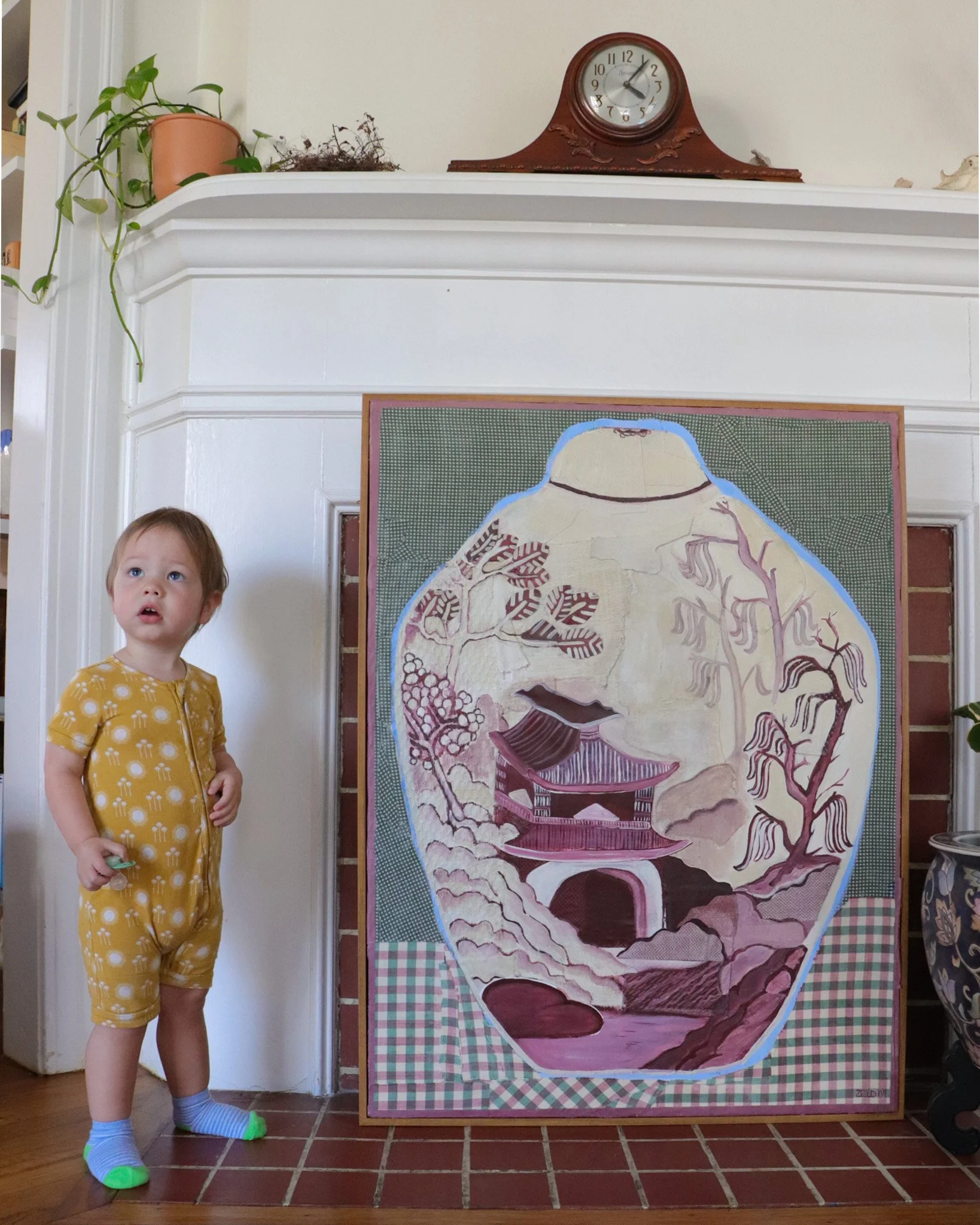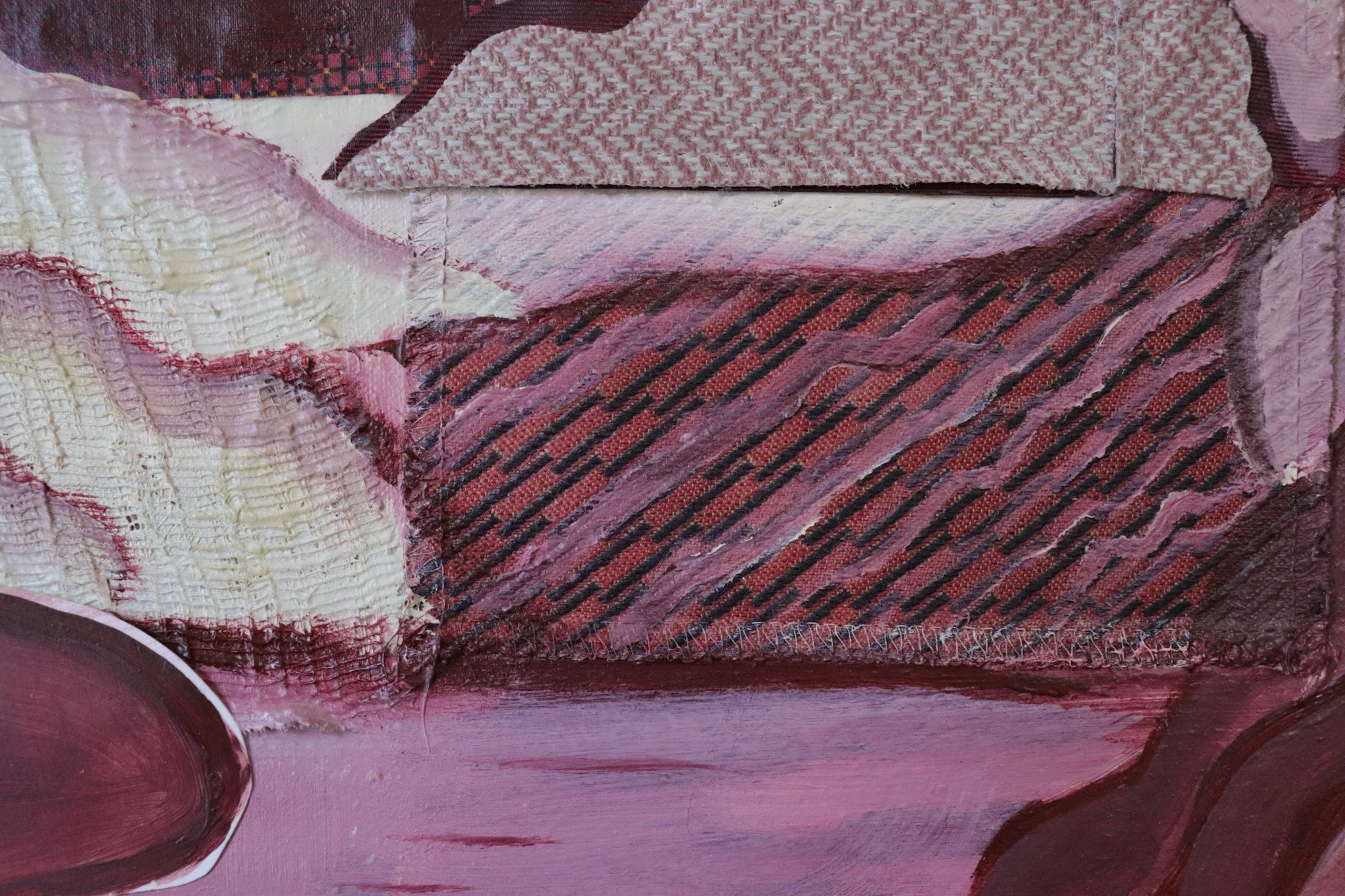 This piece combines layers of textiles, paper, and acrylic paint to create a textured, multi-dimensional composition. The soft color palette and quiet atmosphere evoke a sense of nostalgia and the intimate stillness of a room—one that could belong to a child or a space in transition. The vase, while a simple object, plays with the idea of containment and imitation, a theme I return to often in my work. It’s about the tension between the natural world and the manmade structures we create to hold it.
